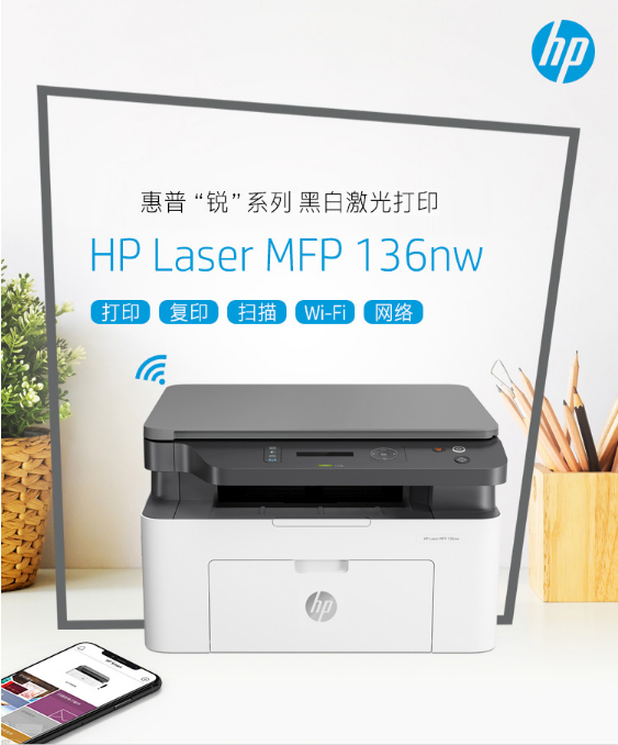 惠普(HP) 136nw黑白多功能一體機(jī)復(fù)印掃描辦公(三合一+有線/無線連接)